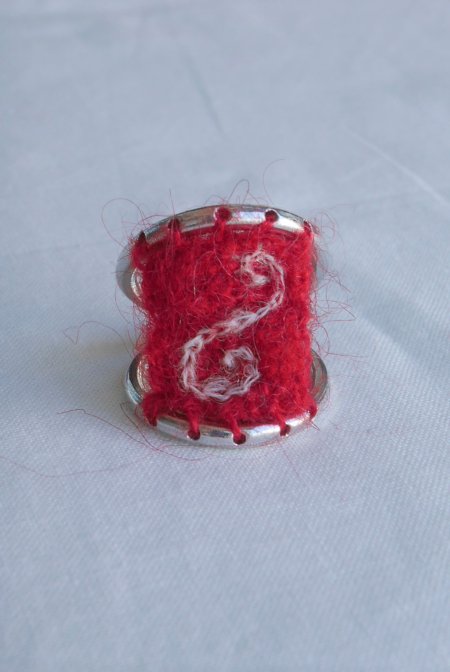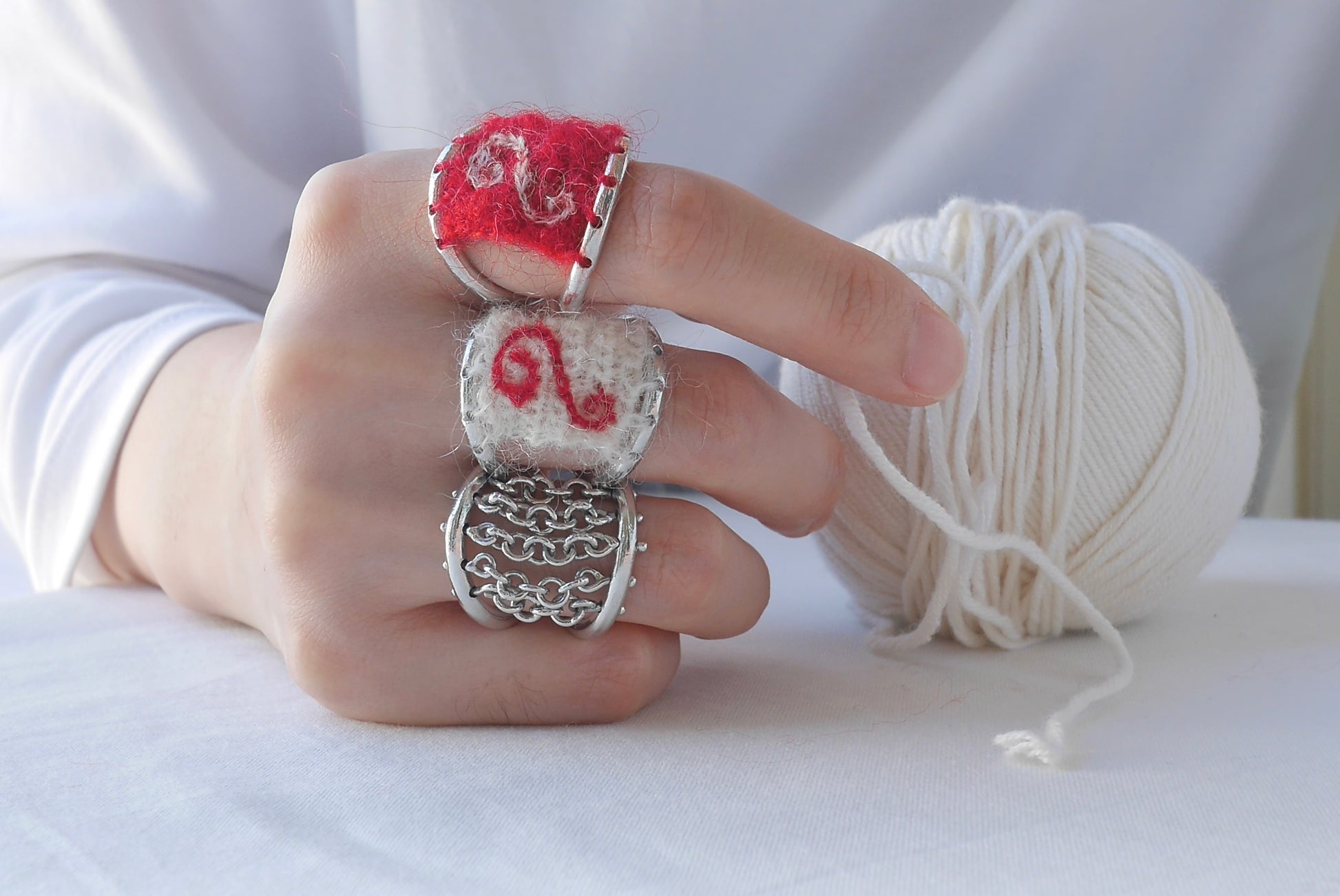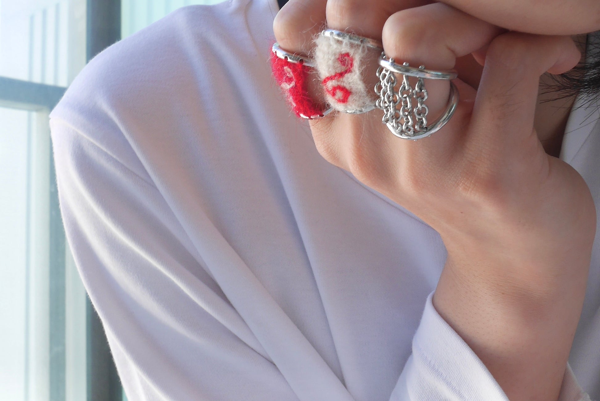 링에 구멍을 뚫어 손뜨개로 실을 엮은 디자인입니다.