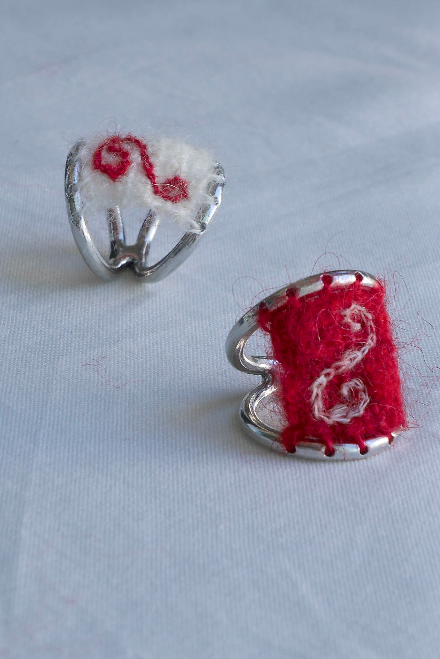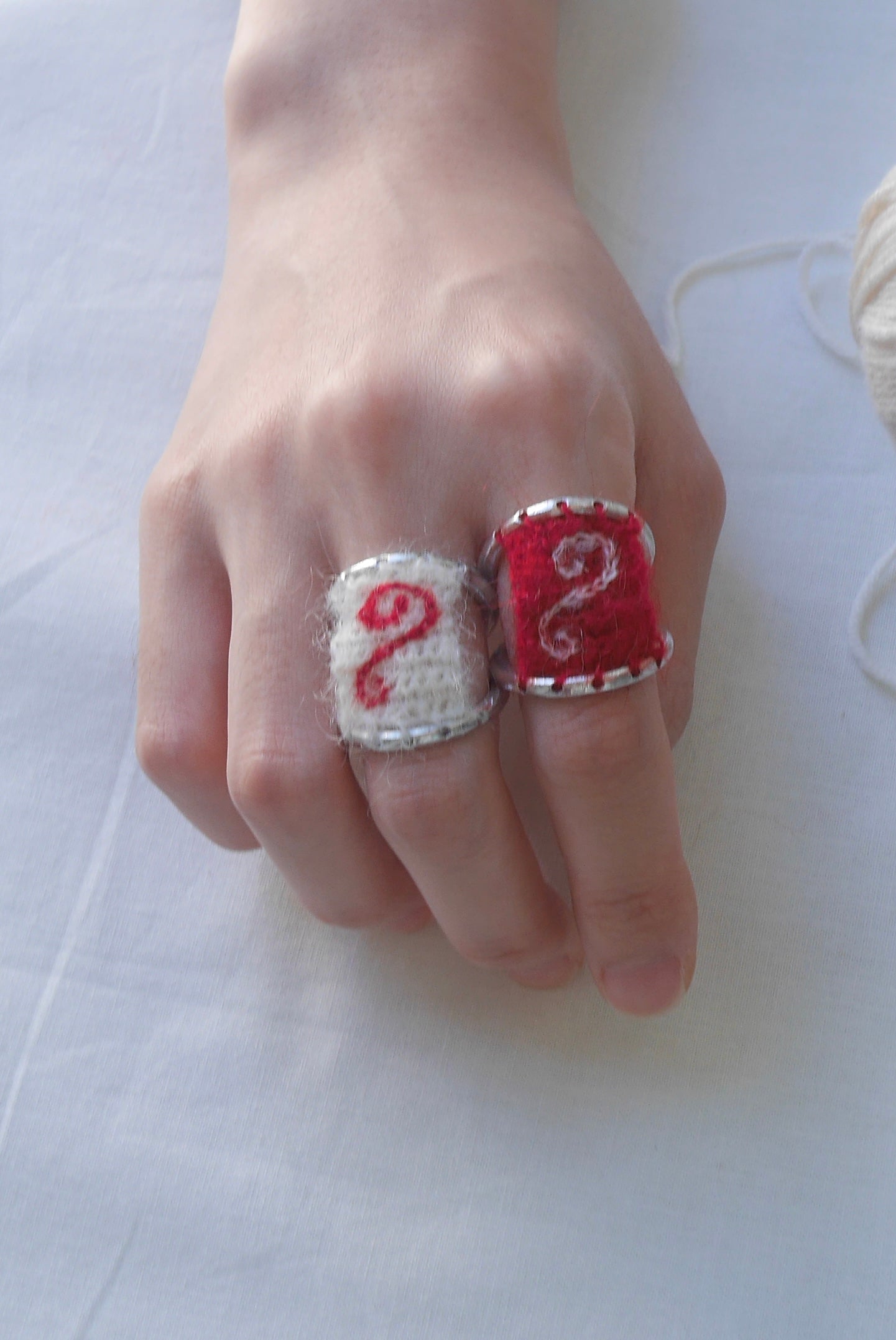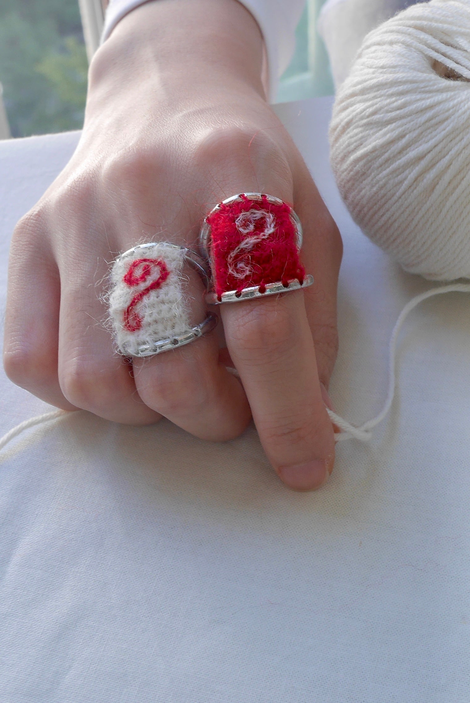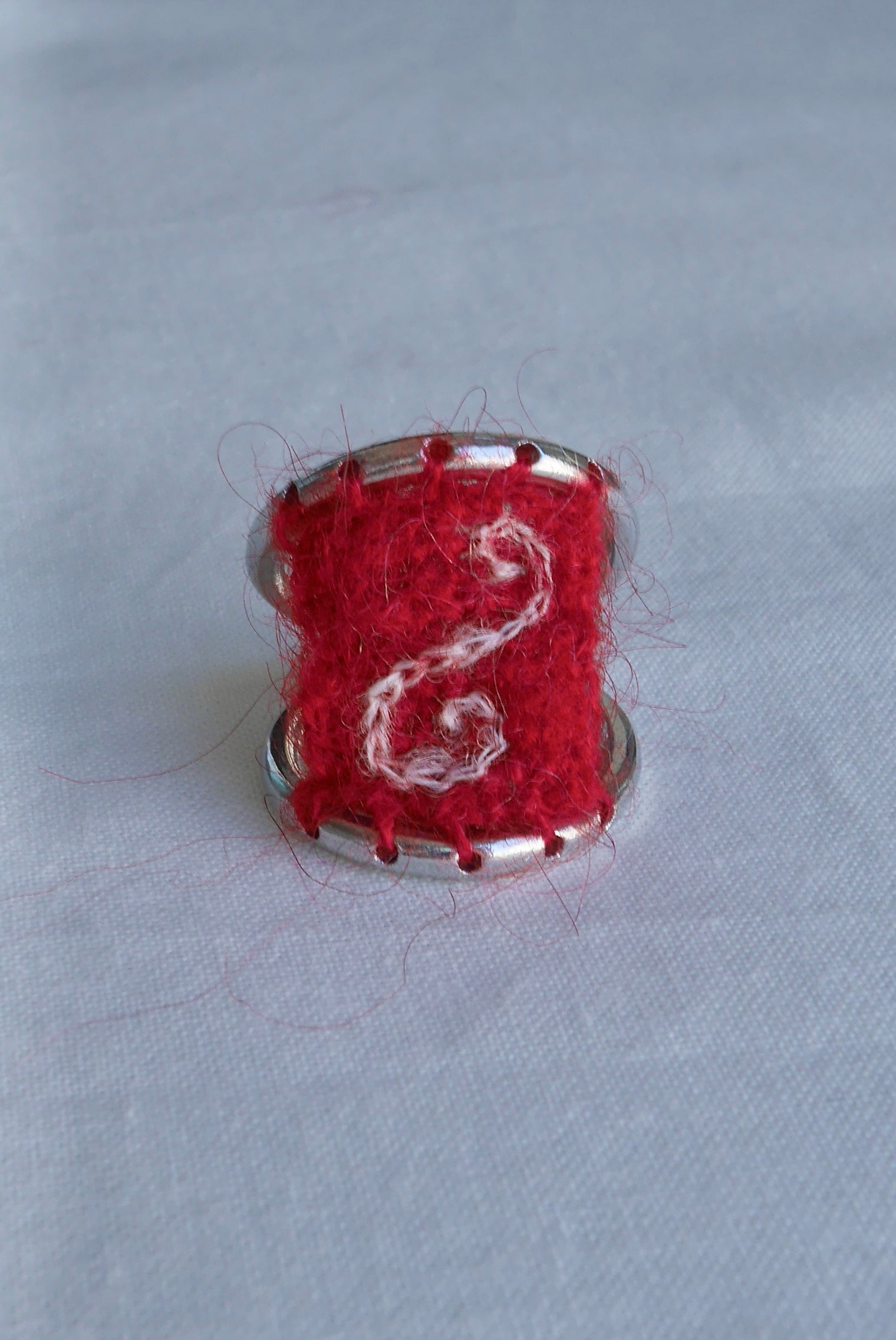 링에 구멍을 뚫어 손뜨개로 실을 엮은 디자인입니다.