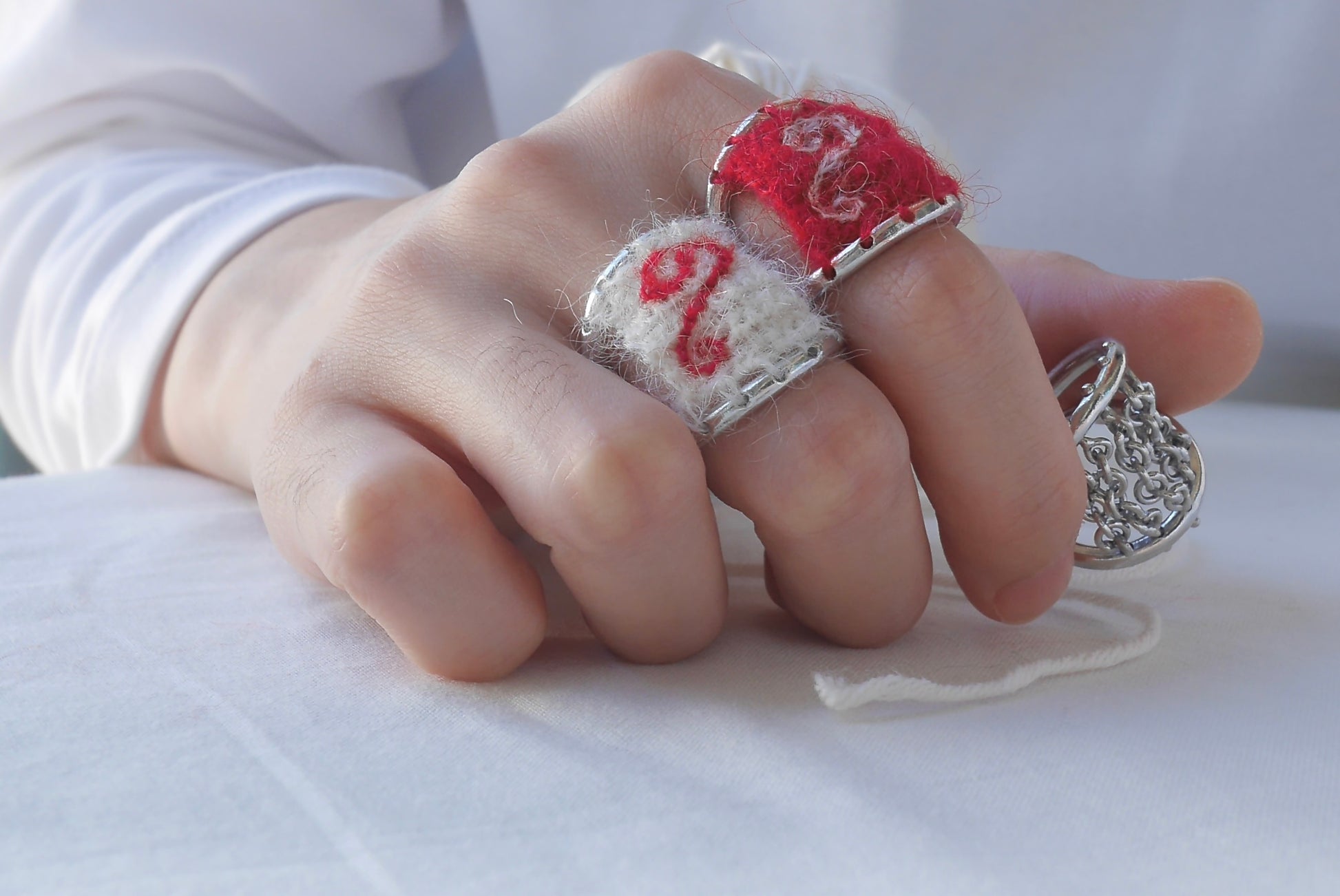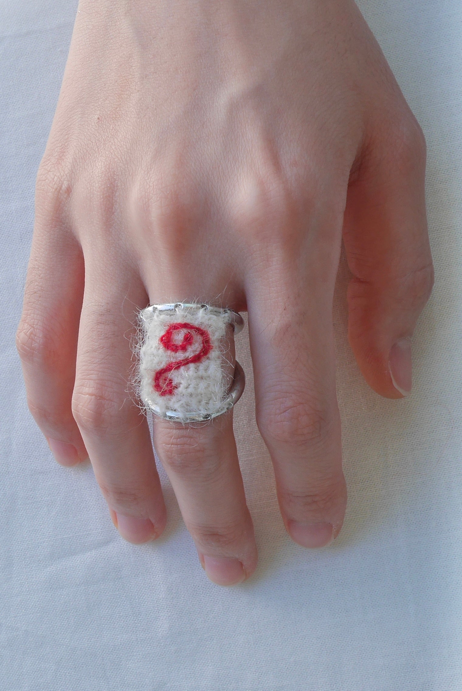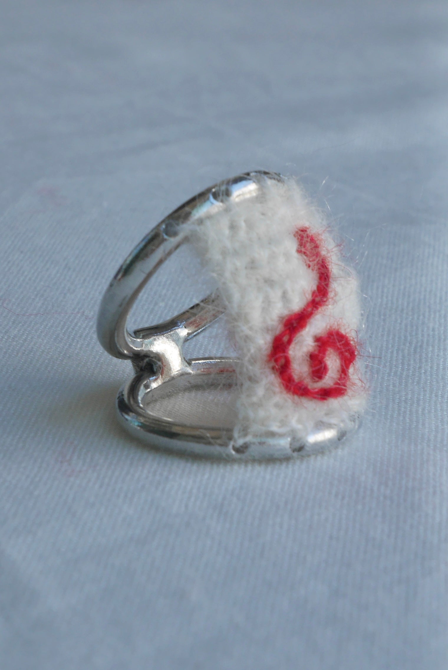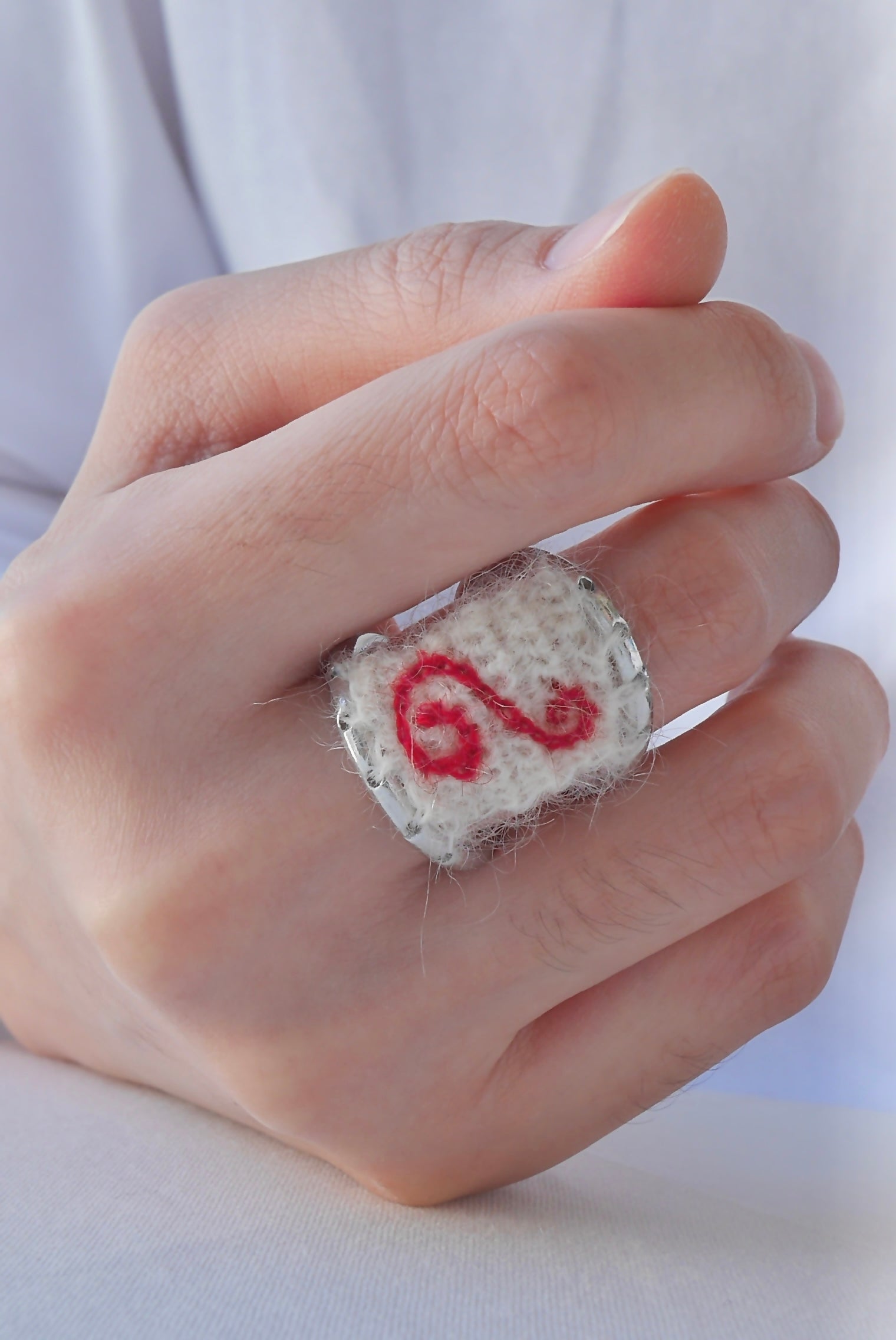 링에 구멍을 뚫어 손뜨개로 실을 엮은 디자인입니다.